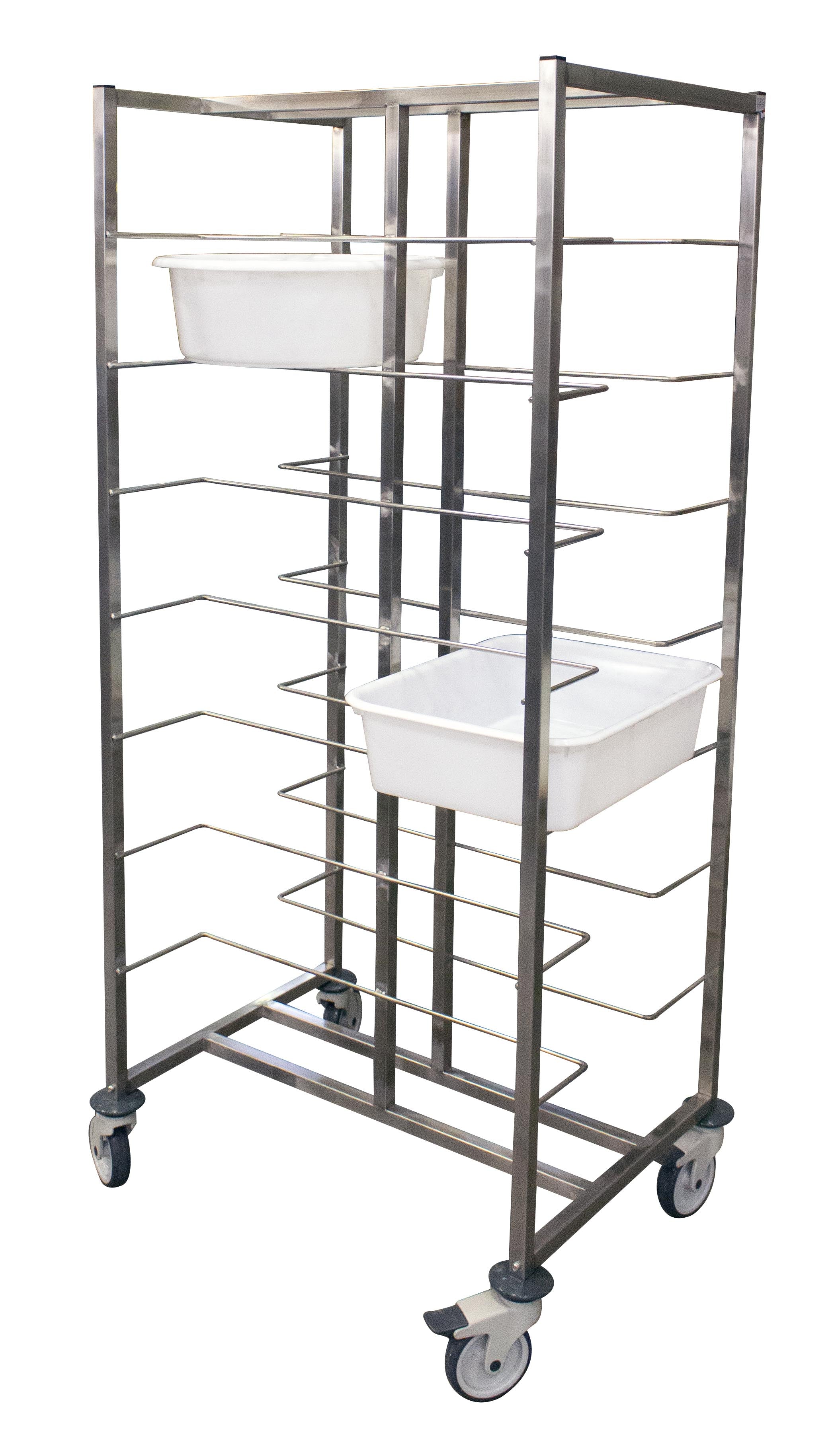 Construction inox monobloc en tube carré 25x25 mm support de bacs en fil de 8 mm, espacement de 180 mm 4 roues caoutchouc ø 125 mm, chape polyamide, pivotantes pour bacs de diviseuse ronds ou rectangulaires