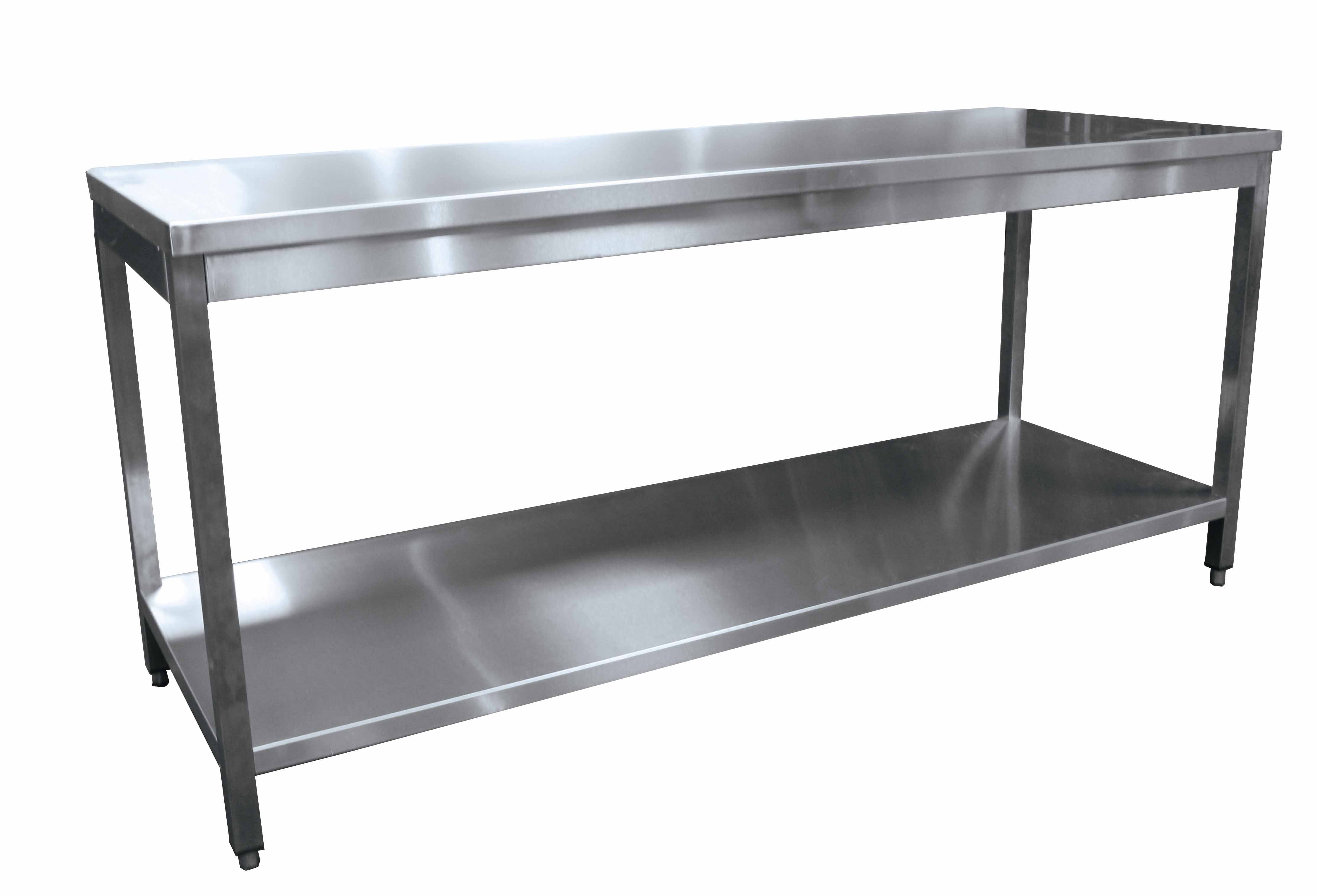 Dessus inox h40 mm doublé mélaminé ép.16 mm piètement : tube inox 40x40 mm à visser bandeau périphérique h65 mm vérins réglables inox antidérapants etagère inox à 190 mm du sol, avec oméga de renfort sur toutes les dimensions livrée démontée : visserie et clé de serrage incluses