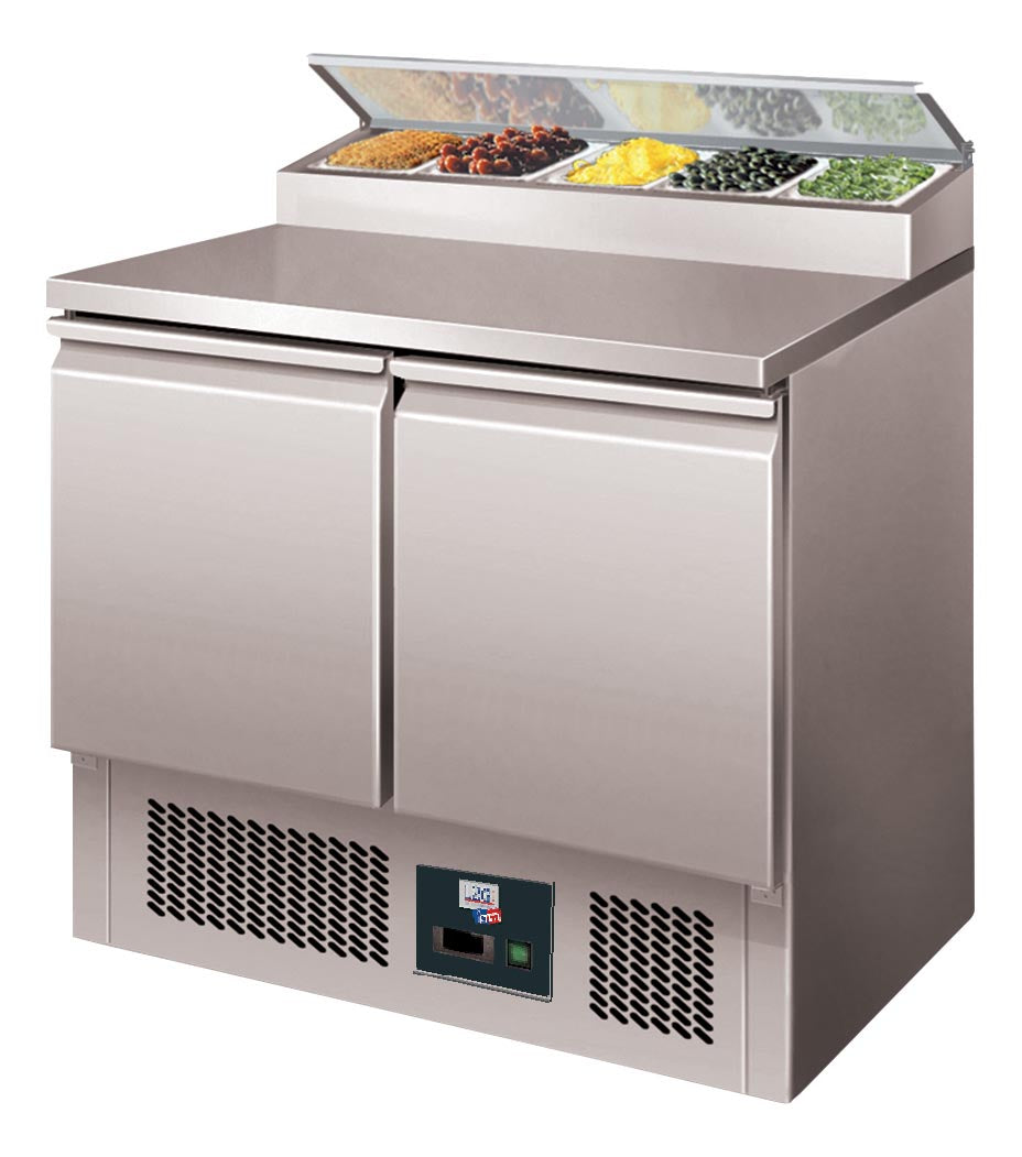 Construction inox intérieur et extérieur réfrigération assisstée, +2°c/+8°c, groupe logé couvercle inox (capacité 5 ou 8 gn1/6150 non fournis) plan de travail inox 2 portes avec fermeture automatique dotation : 1 niveau de glissières et 1 grille par porte dégivrage automatique isolation 35 mm (mousse polyuréthane) thermostat électronique dixell gaz réfrigérant : r600a