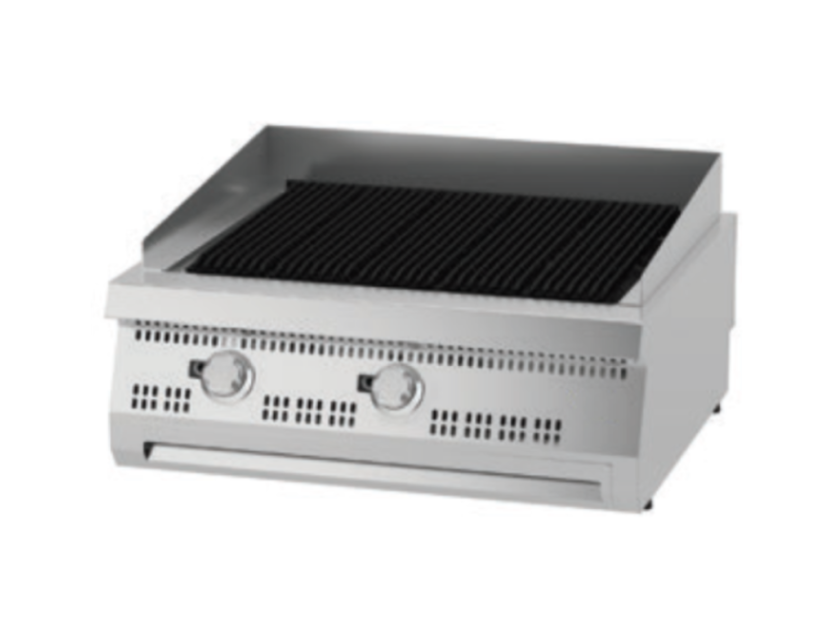 Sous les grilles supérieures inclinées se trouve une plaque de gril en fonte, qui assure une répartition uniforme de la chaleur et permet d'utiliser toute la surface du gril. Les pare-éclaboussures en acier inoxydable protègent contre les projections d'huile. Le thermostat de sécurité permet de régler les sources de chaleur séparément sur une plage comprise entre 100 et 300°C. Le gril est également équipé d'une soupape de sécurité avec thermocouple, qui veille à ce que le papillon reste ouvert tant que le capteur détecte de la chaleur. Dès qu'il n'y a plus de flamme, la soupape se ferme automatiquement pour empêcher le gaz de s'échapper. Le brûleur est équipé d'une flamme pilote pour une utilisation sûre et confortable. Le gril peut être alimenté au GPL ou au gaz naturel. Il peut être placé sur une ligne de cuisson et vous pouvez l'agrandir en commandant un socle, avec ou sans placard en dessous.